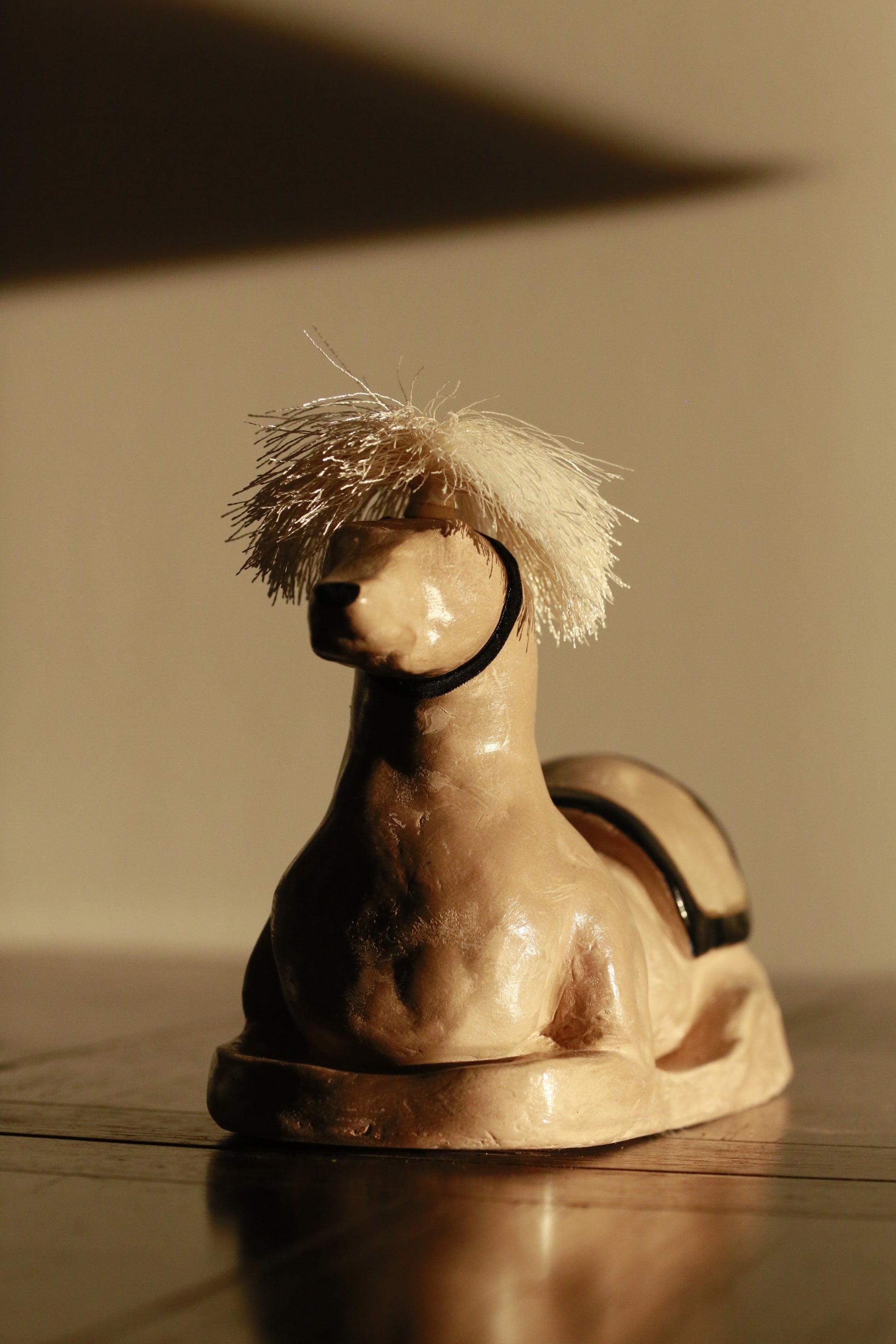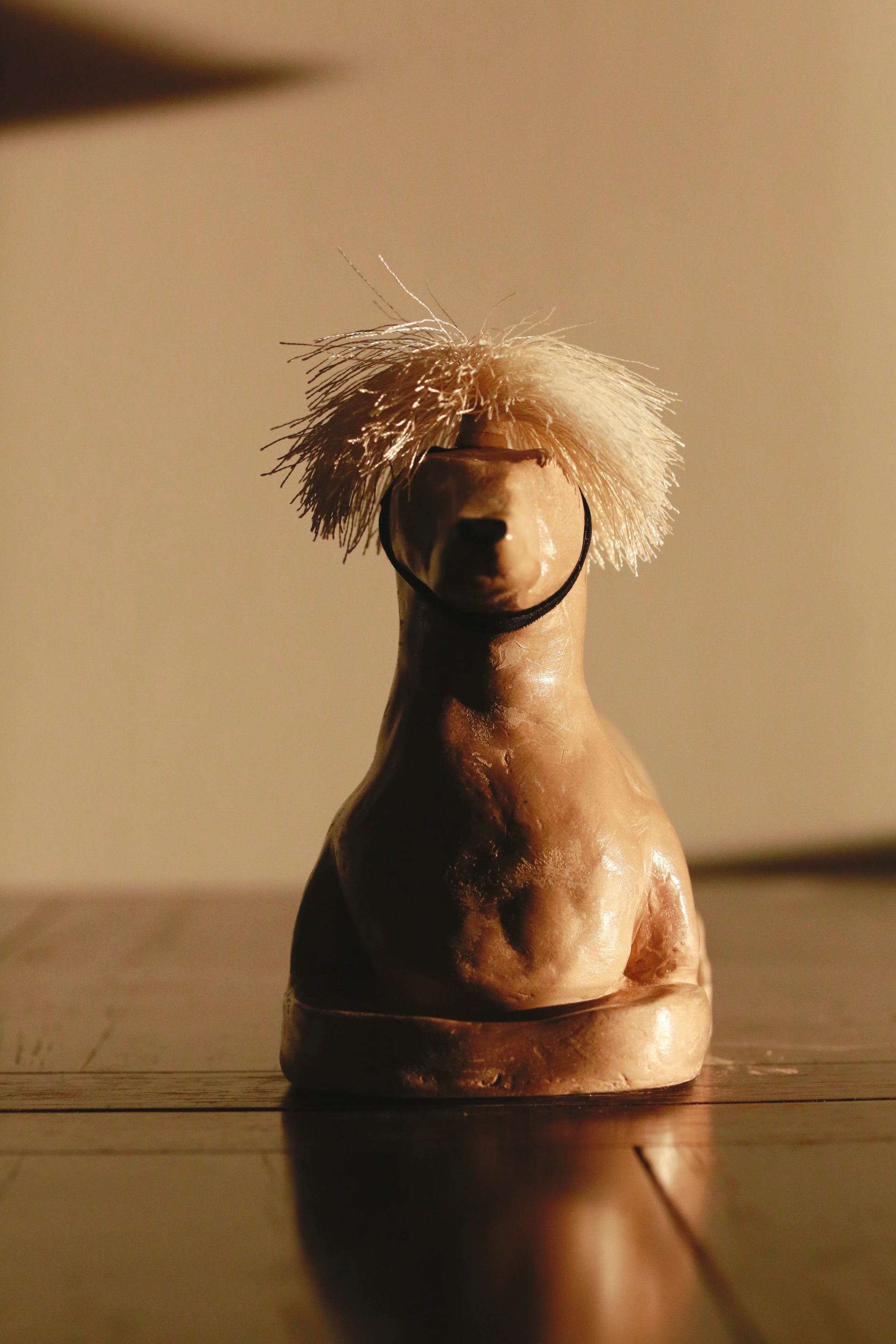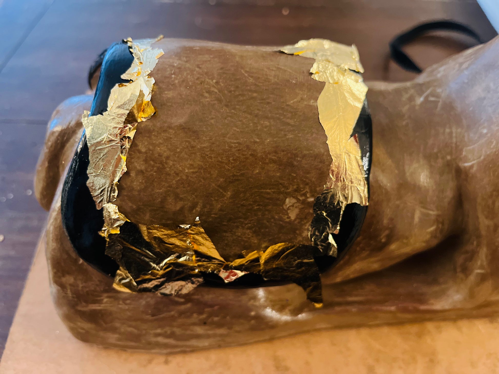 Terracotta, Golden leaf, acrylic paint, silk threads, varnished.