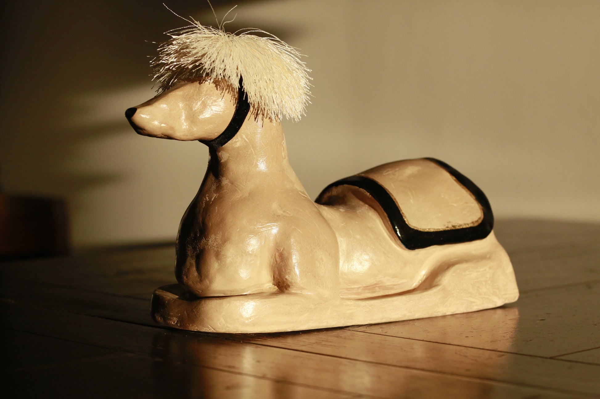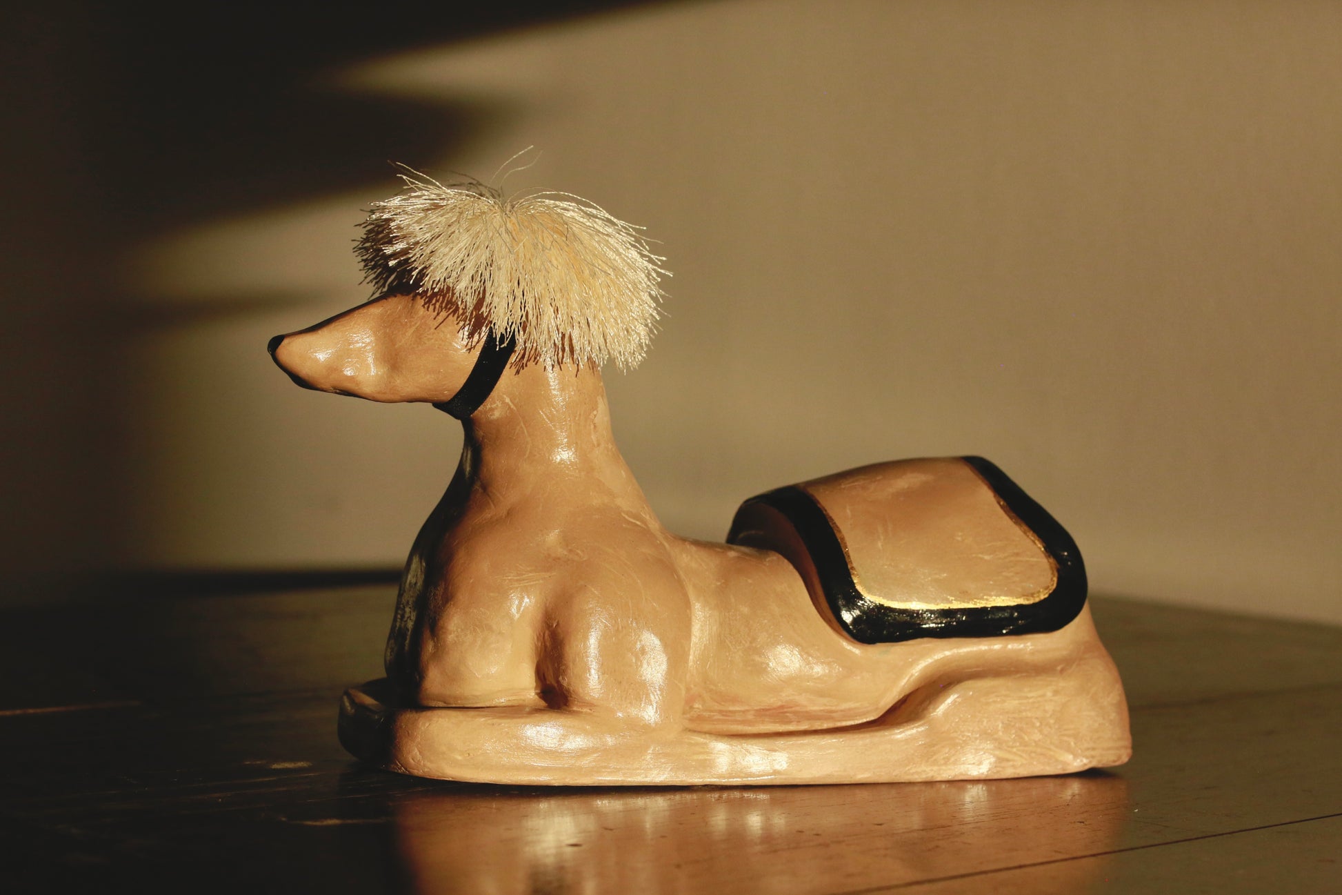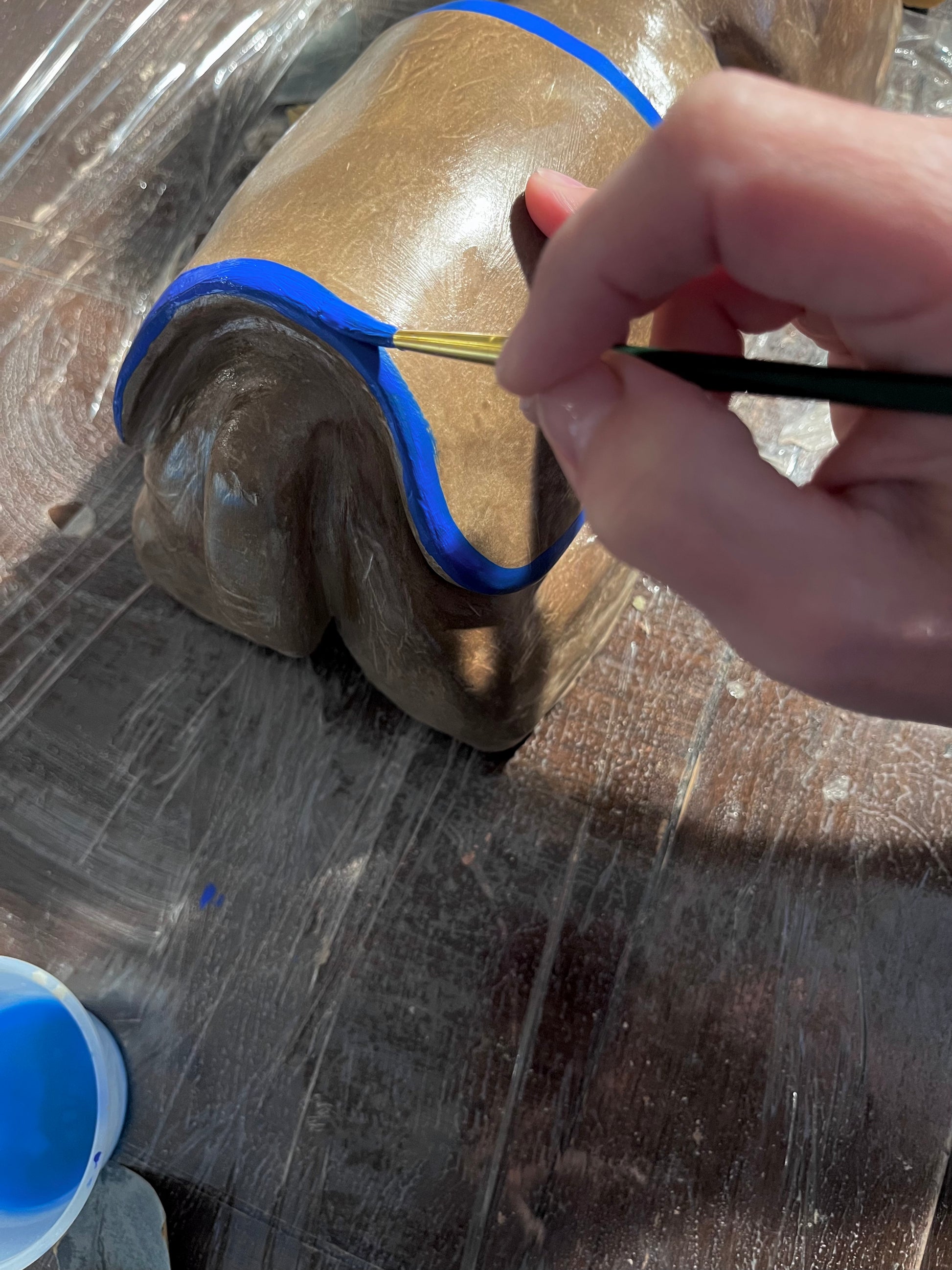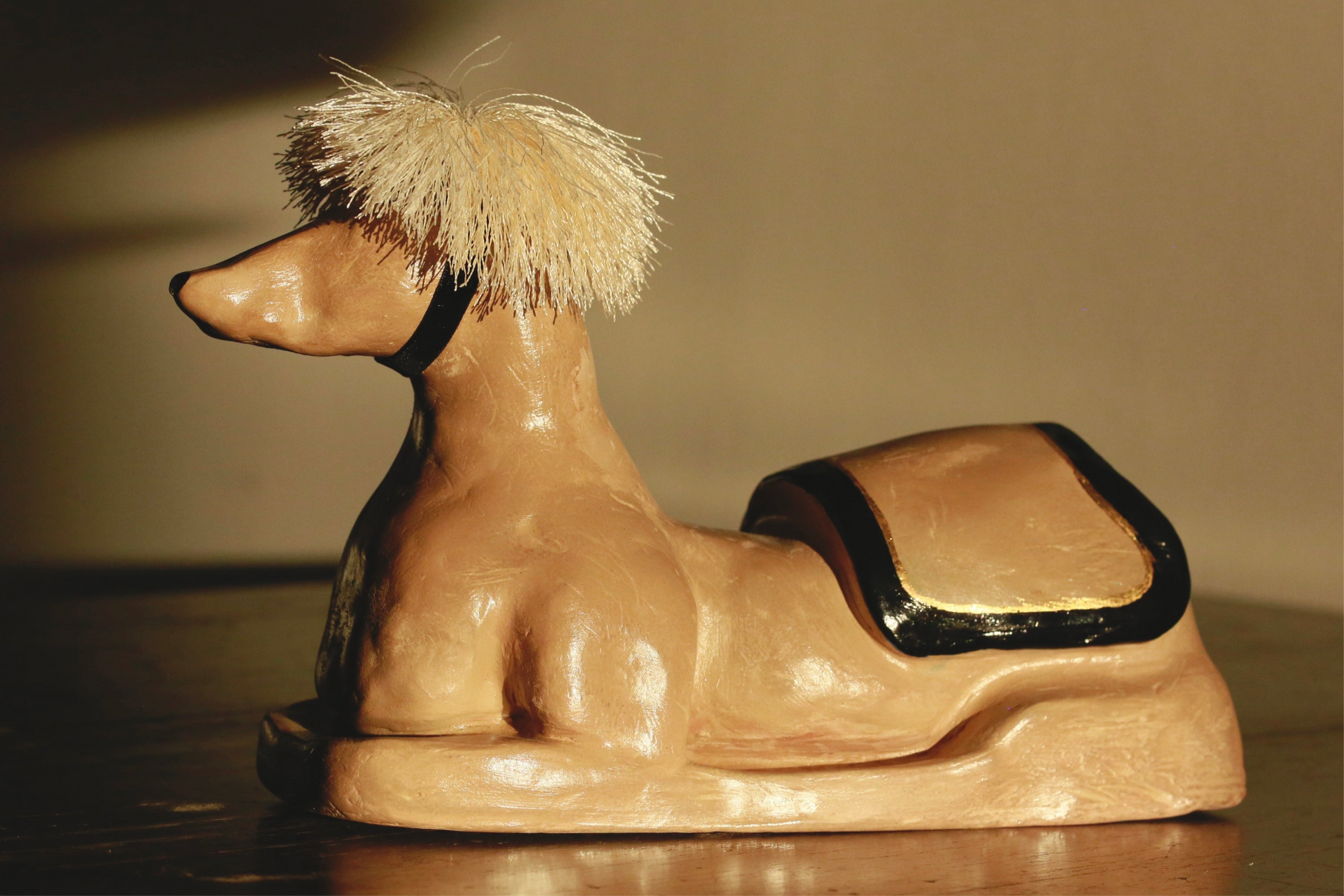 Terracotta, Golden leaf, acrylic paint, silk threads, varnished.