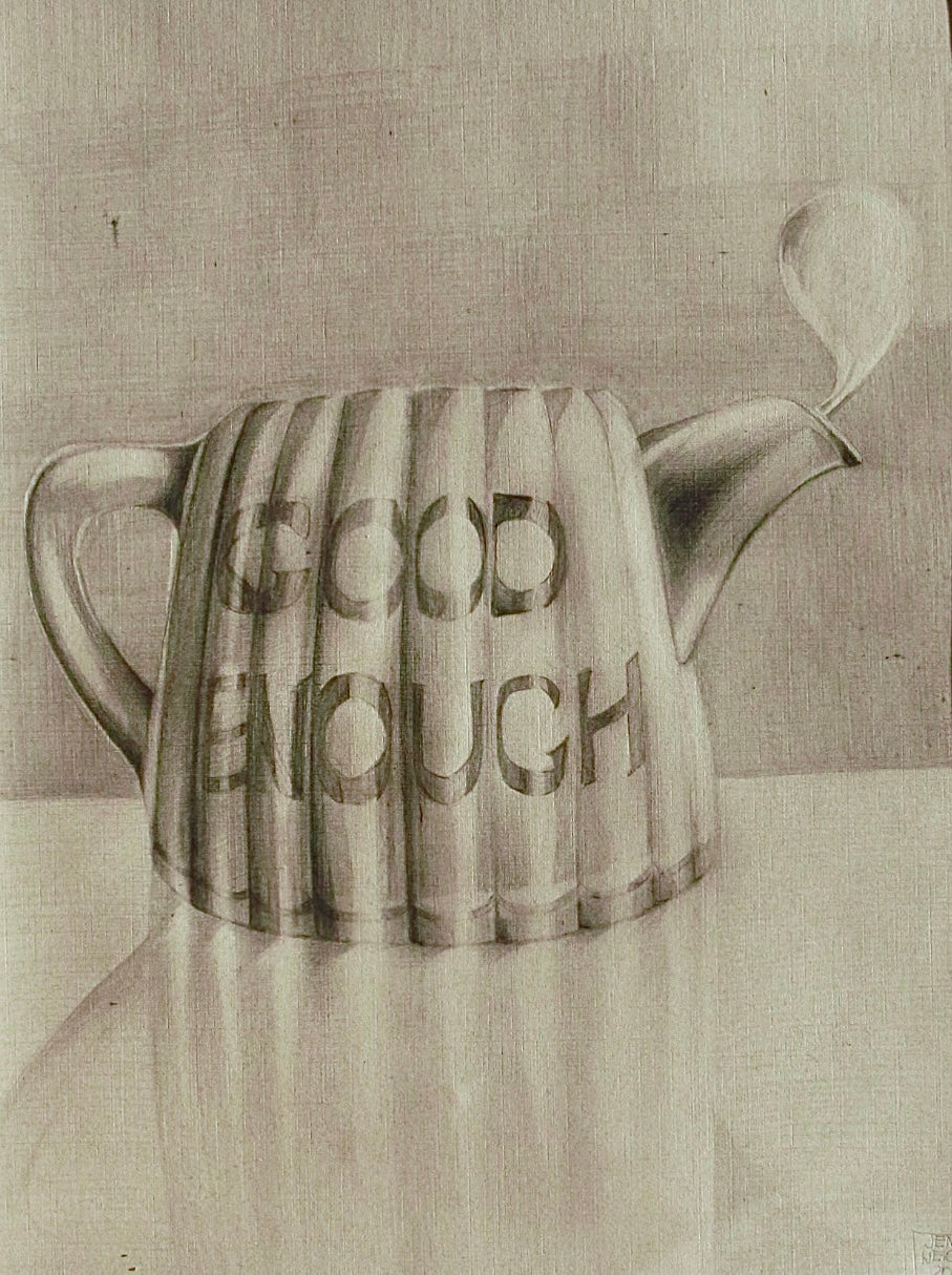 A teapot simmers, its surface inscribed with “GOOD ENOUGH,” a plea for approval—whether to itself or others. Yet from its spout rises only a bubble, fragile and doomed to burst in the air. This is not effort, but its illusion—a tension that will never become release.