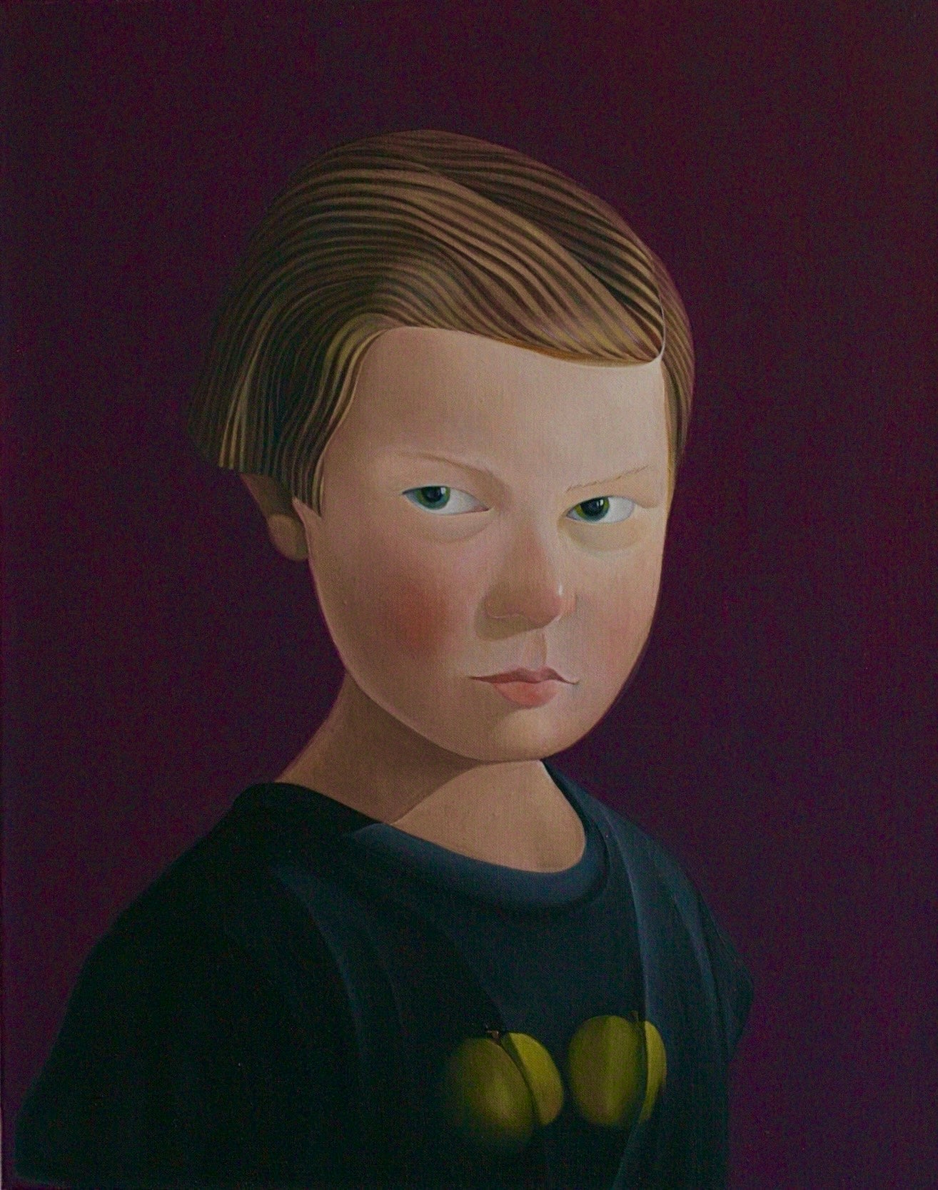 The painting features a muted, almost somber color palette, with deep reds in the background contrasting against the dark shirt and the subtle skin tones of the subject. This choice creates a dramatic effect, drawing the viewer’s attention to the figure.