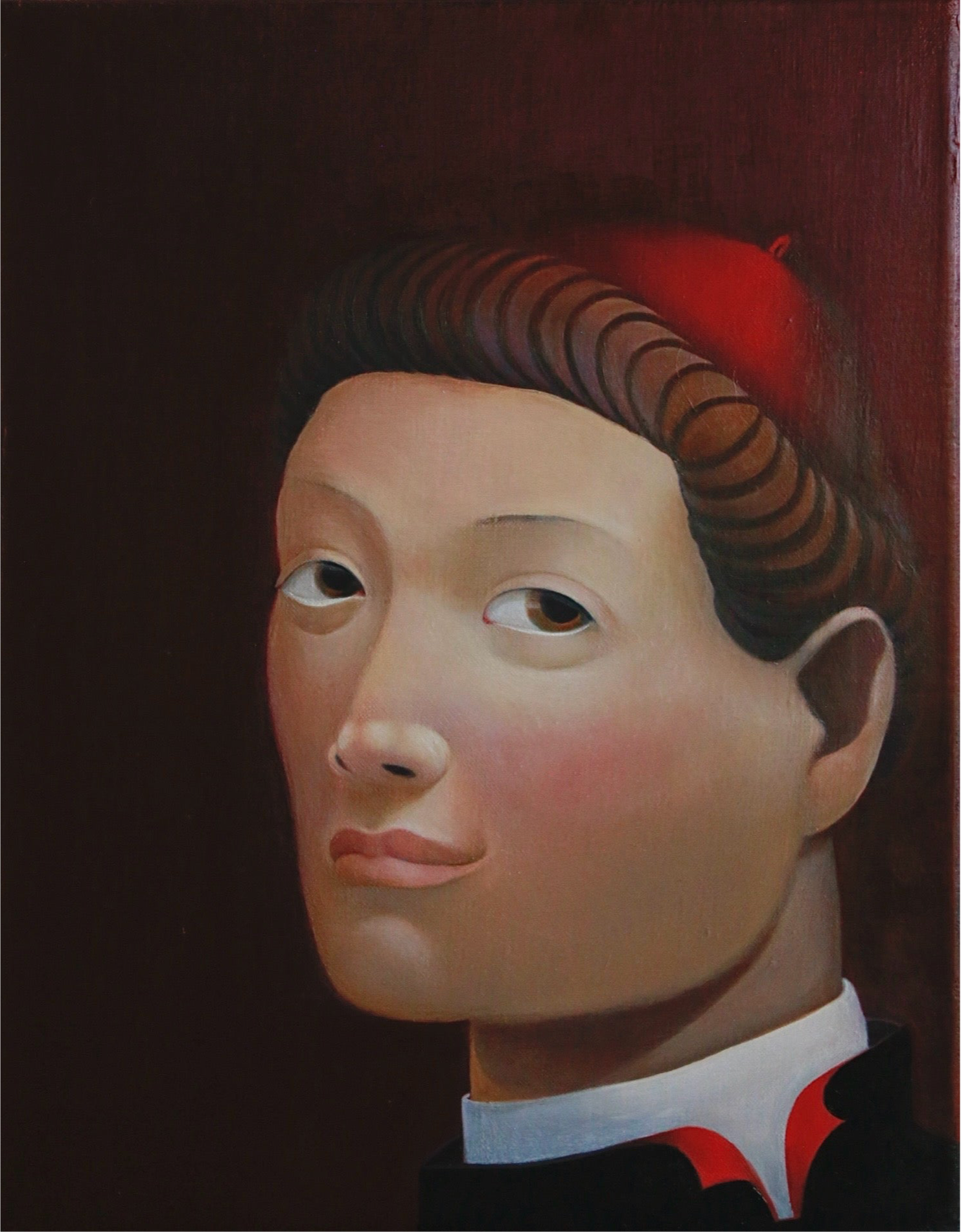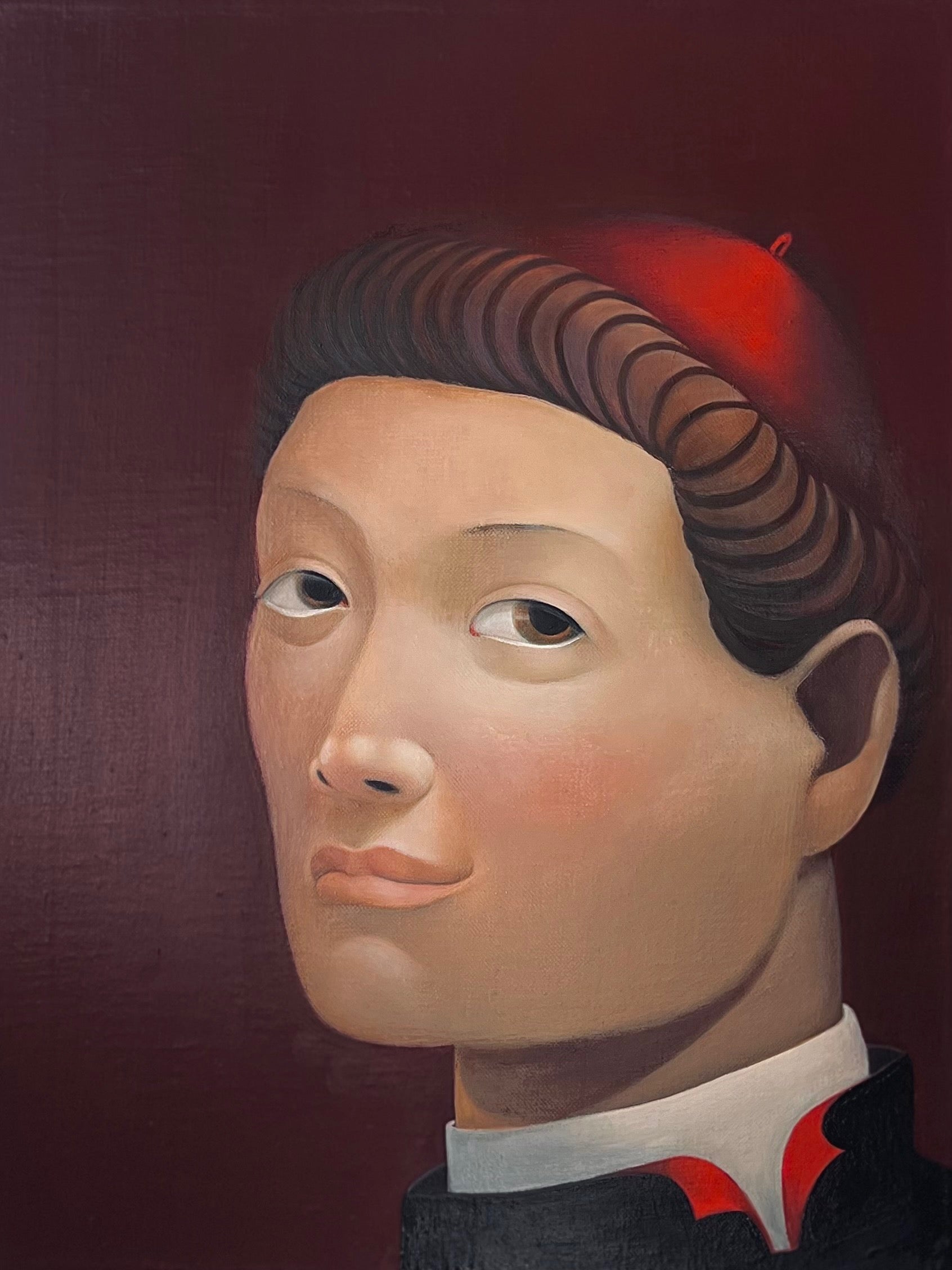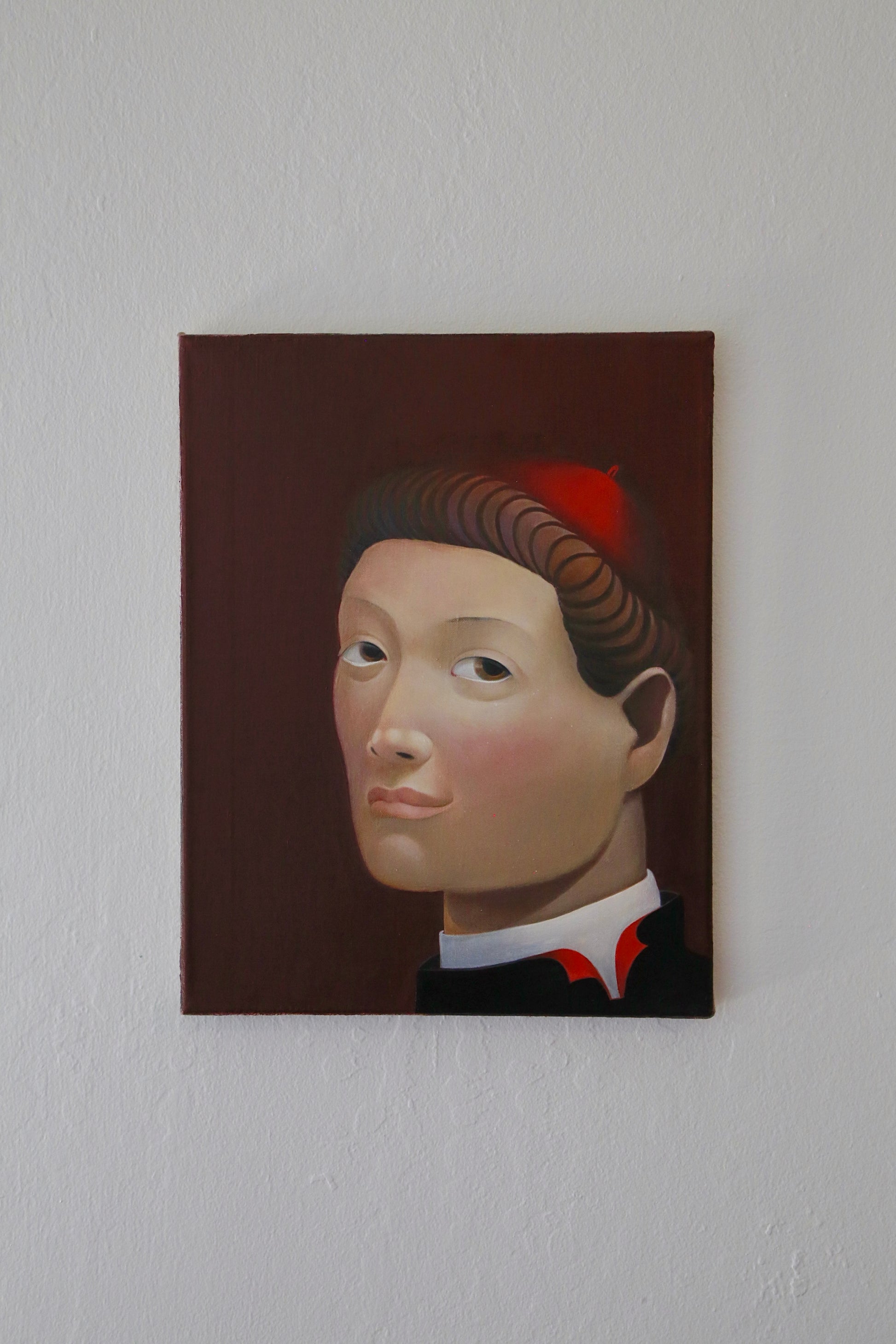 This painting engages directly with the visual language of Renaissance portraiture while intentionally subverting its conventions. The sitter’s smooth modeling, restrained palette, and carefully balanced composition recall the quattrocento masters such as Piero della Francesca and early Florentine portraitists, whose works emphasized harmony, clarity, and the dignity of the subject. Yet here, the elongated features, stylized coiffure, and slightly exaggerated gaze disrupt the idealization, creating a sense of detachment and irony.